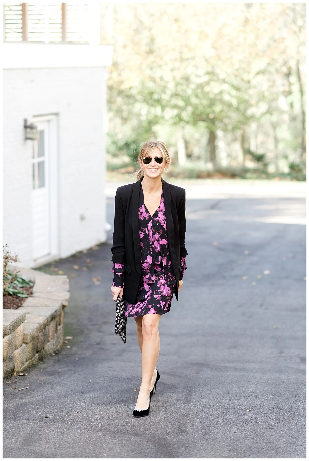 I have always loved Parker dresses. They are super flattering and comfortable. I fell in love with this floral long sleeve dress because I knew it could be worn on its own or with a blazer (similar)! I paired the look with velvet heels (similar) and a gorgeous star print Rebecca Minkoff clutch (on sale!). This look is sophisticated and shows how mixing patterns can be so much fun!!